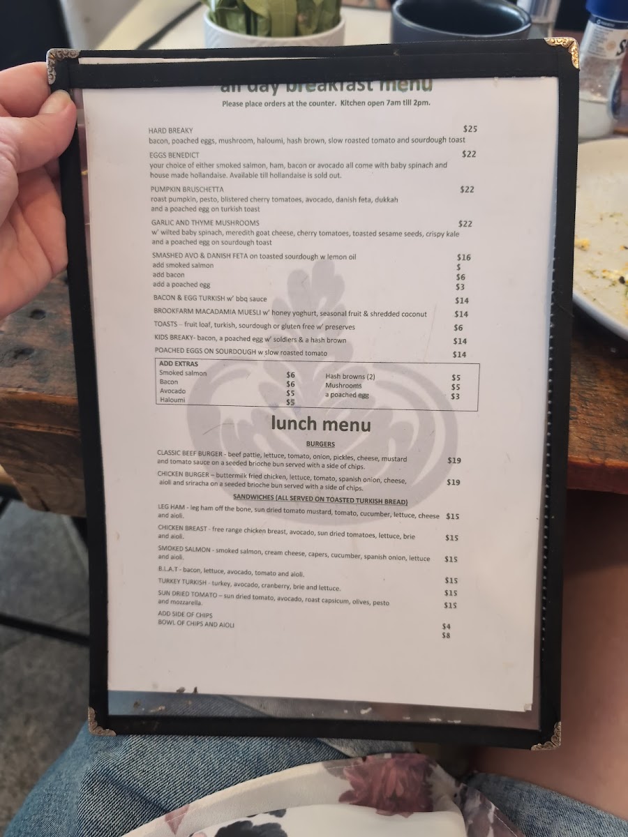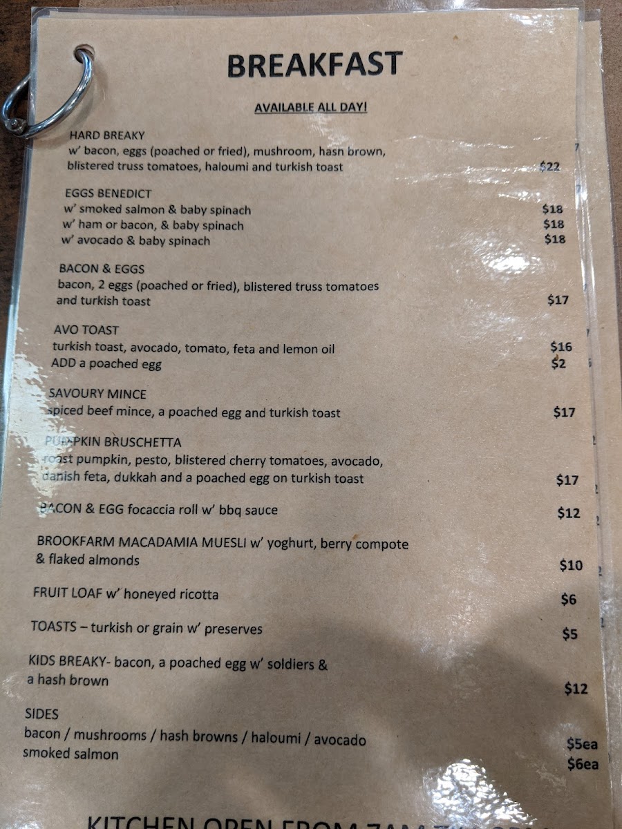 - Breakfast Highlights: Don't miss the Bacon & Eggs or the trendy Avo Toast. For the lighter side, opt for the Brookfarm Macadamia Muesli.